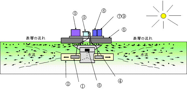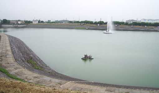 当調節池は湖面延長が約5kmあり、流れがないために滞留時間が長く、夏期には水深が約2mとなります。そのため、毎年7月から9月にかけ日照による水温上昇等の環境条件の変化により、植物プランクトン(アオコ)が発生します。このアオコが大量に発生すると、水面に溜まり、美観・景観が損なわれるとともに、異臭発生や水質の悪化につながります。アオコ発生の抑制対策のひとつとして、細胞のガス胞破壊に注目し、超音波を用いた水質改善対策を行っています。